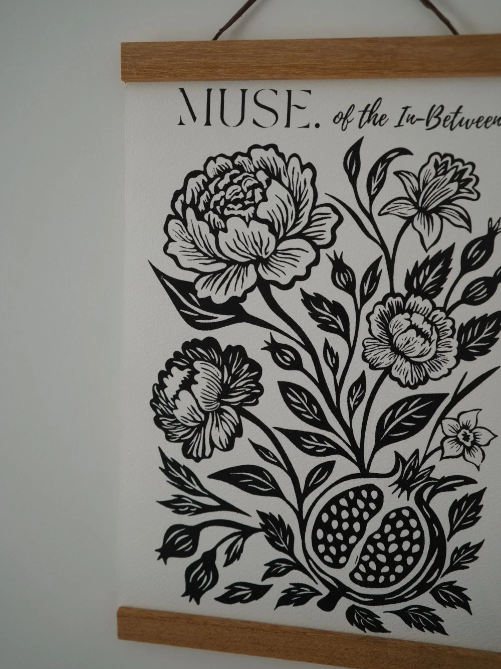Printed by hand on natural, flower-embedded paper, this silkscreen artwork celebrates transformation and rebirth. “Muse of the In-Between” is inspired by Persephone - goddess of cycles, shadow and bloom.